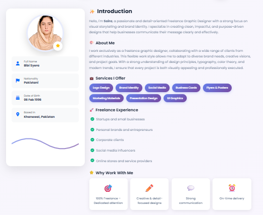 Hello, I'm Saira, a passionate and detail-oriented Freelance Graphic Designer with a strong focus on visual storytelling and brand identity. I specialize in creating clean, impactful, and purpose-driven designs that help businesses communicate their message clearly and effectively.